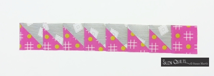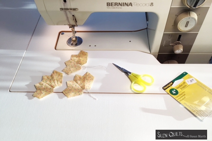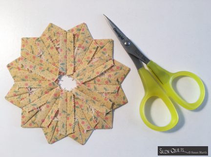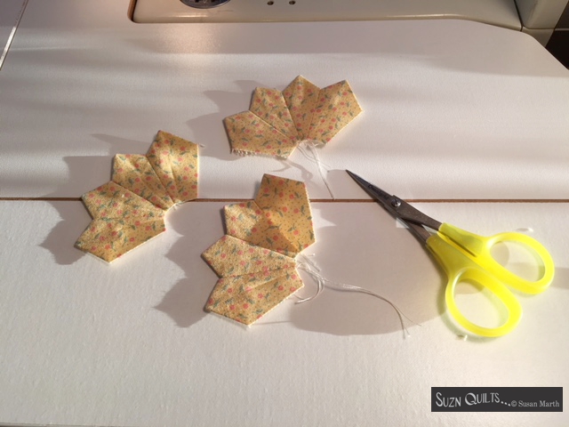 Next, align then glue each half Mini Dresden plate to the center of each triangle.