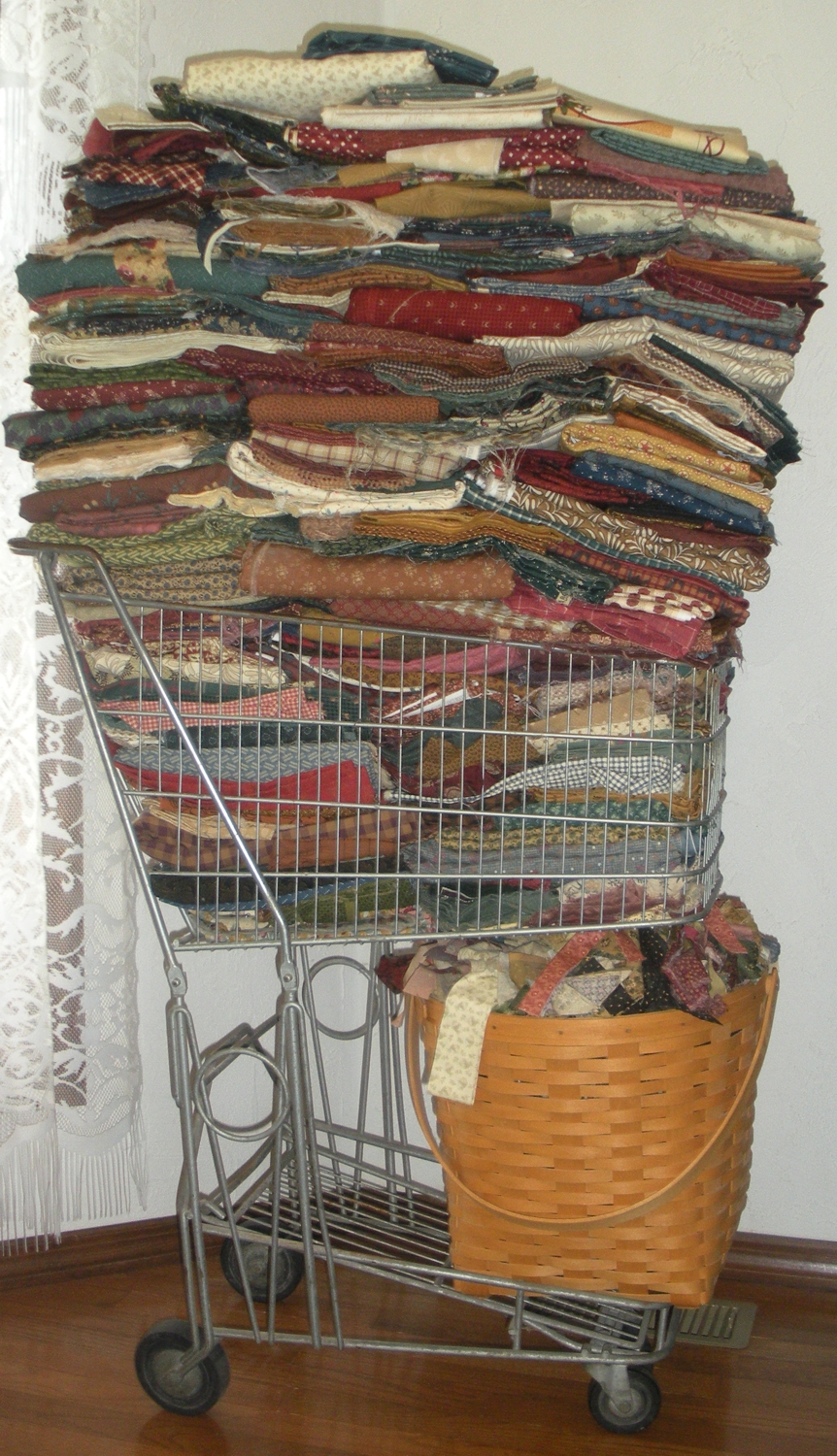 The rather large Longaberger basket is full of Thimbleberries scraps from projects past.