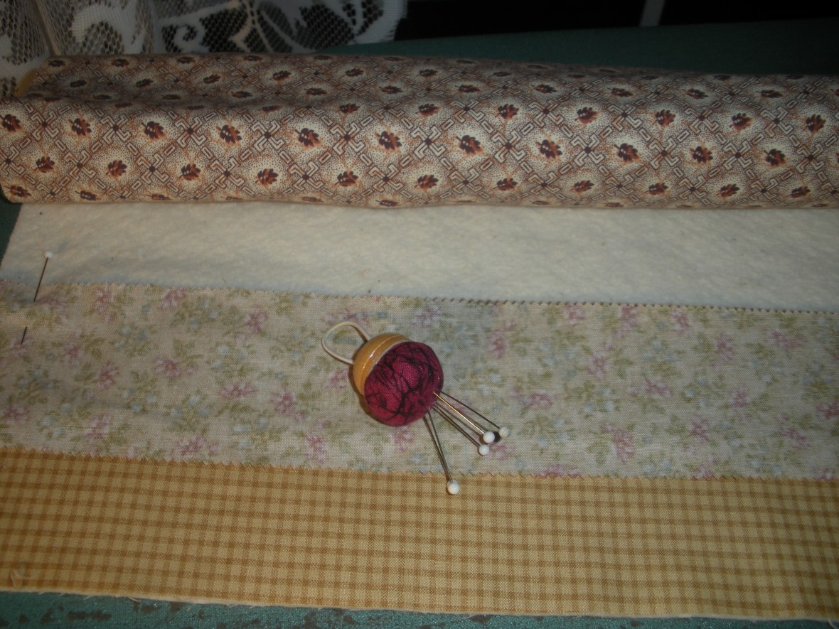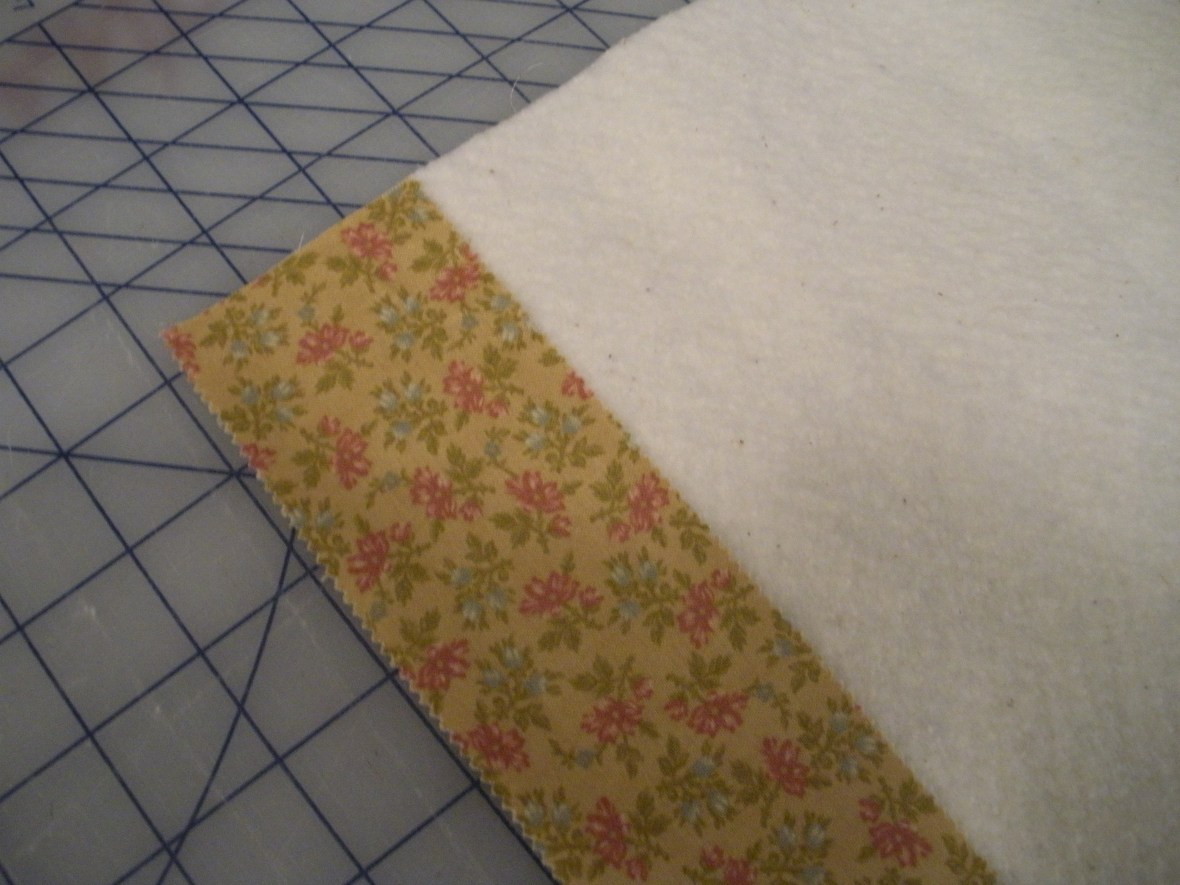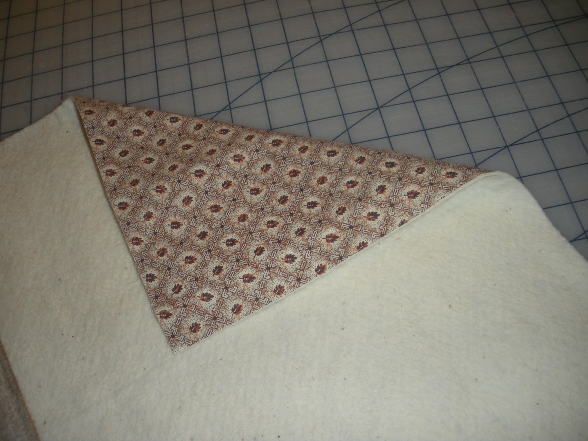 The “foundation” is actually the batting and backing fabric cut to the size of the finished quilt, then basted together. I like to use Sullivan’s basting spray for this. It keeps the foundation together nicely, doesn’t gunk up my needle and there are no pins to move as I sew. Below is a small-scale of what the “foundation” looks like basted and ready to start sewing.