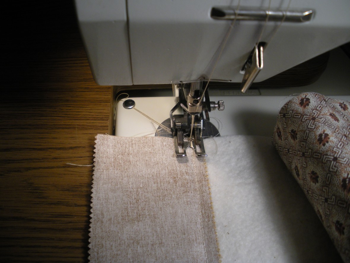 Pin and sew 1/4″ away from the inside edge of strip. The seam is going all the way through the foundation creating the “quilting”.
