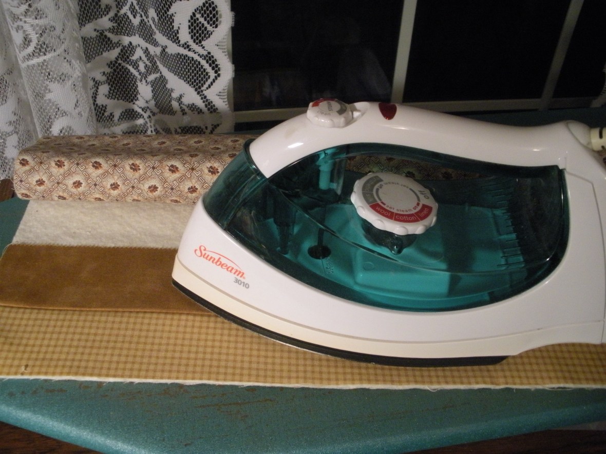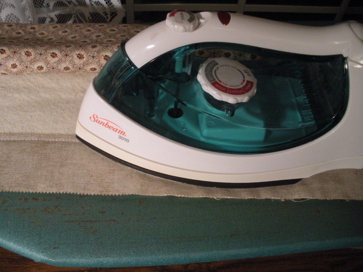 Next comes the pressing. With the strips still flat as sewn, press, picking up the iron as you work down the strip not sliding it. I also do not use any steam, notice empty iron!