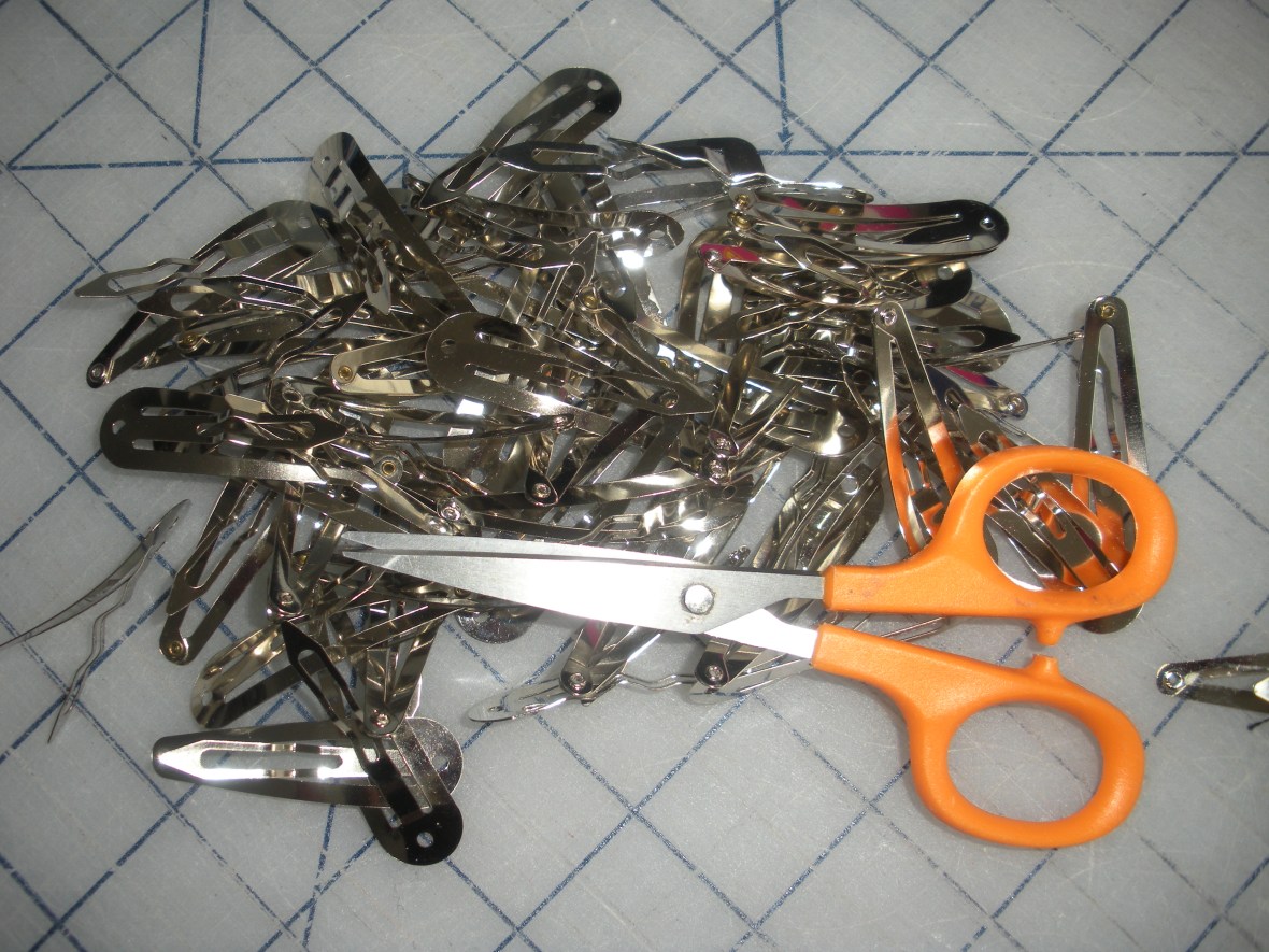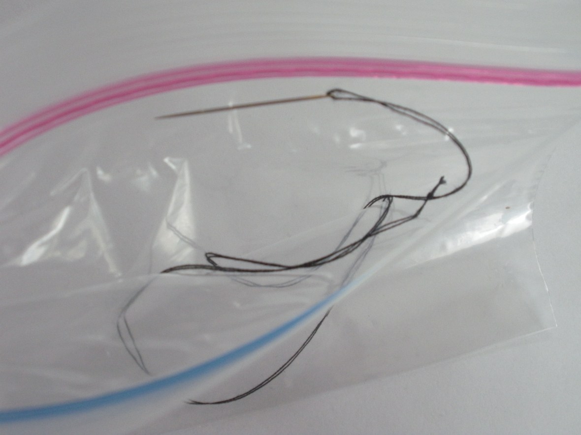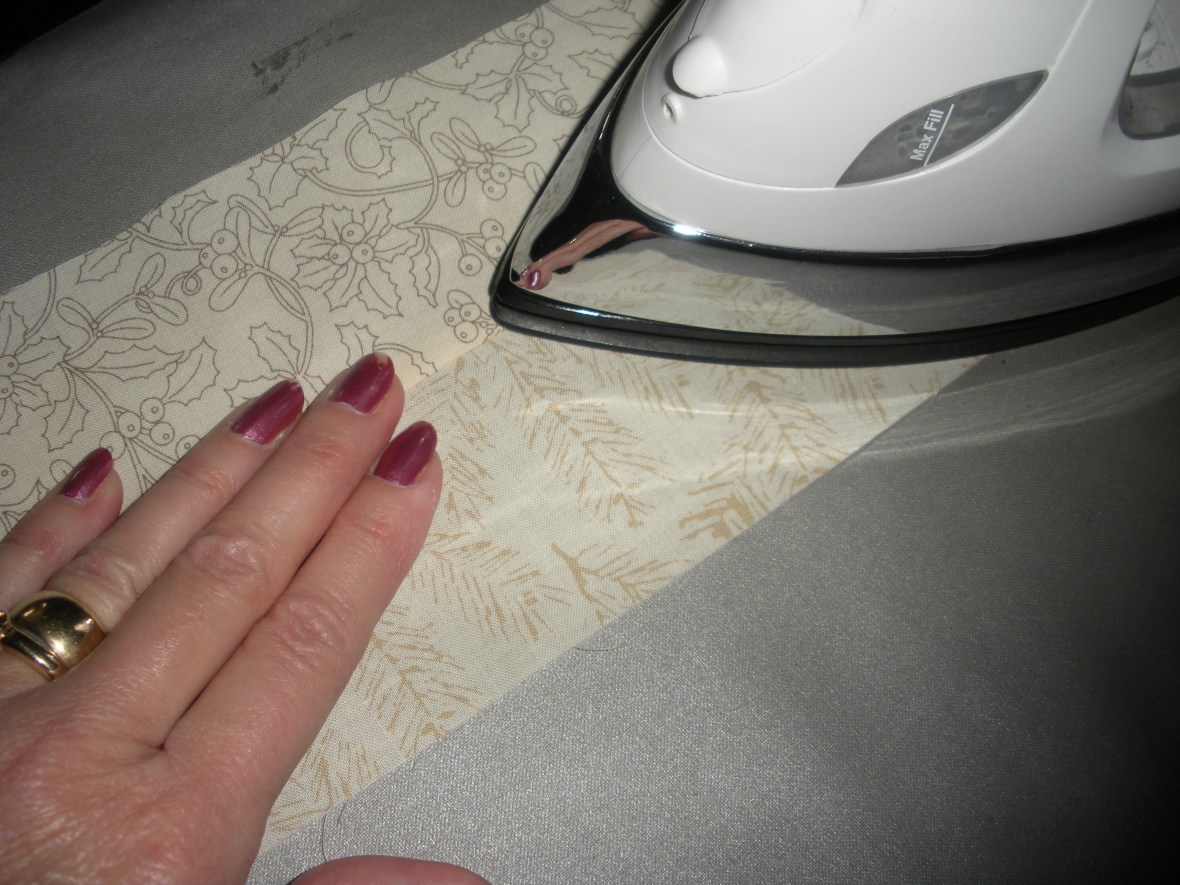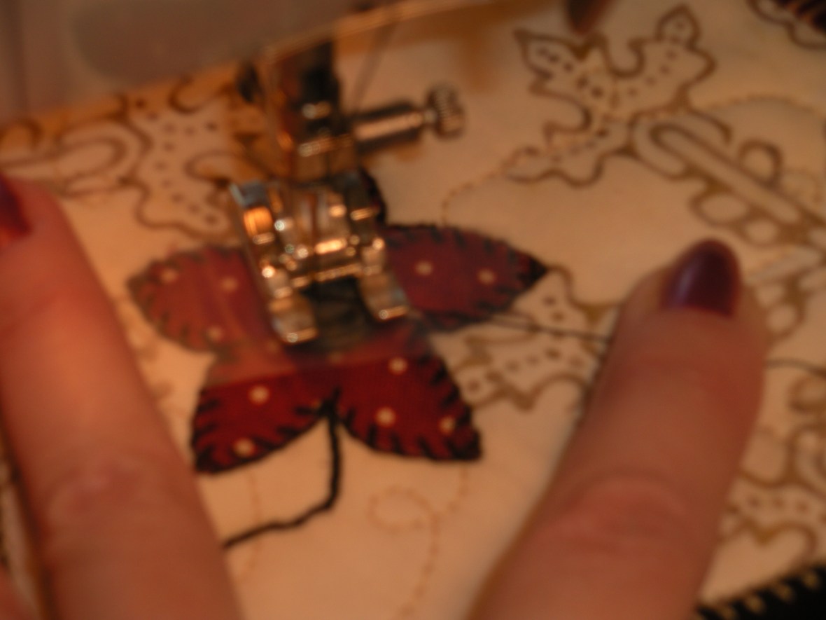 I like to use my open toe applique foot. Probably the most important point in this process (and the blurriest of my photos) is to hold down the thread as you start to sew. First with hand on the fly-wheel turn it toward you getting the setting for the stitch width set. After you’ve gone back and forth into both holes twice, use the foot pedal and sew 8-9 times total. Yes, I usually grimace as I’m doing this although is just a reflex from breaking so many needles in my sewing history!
